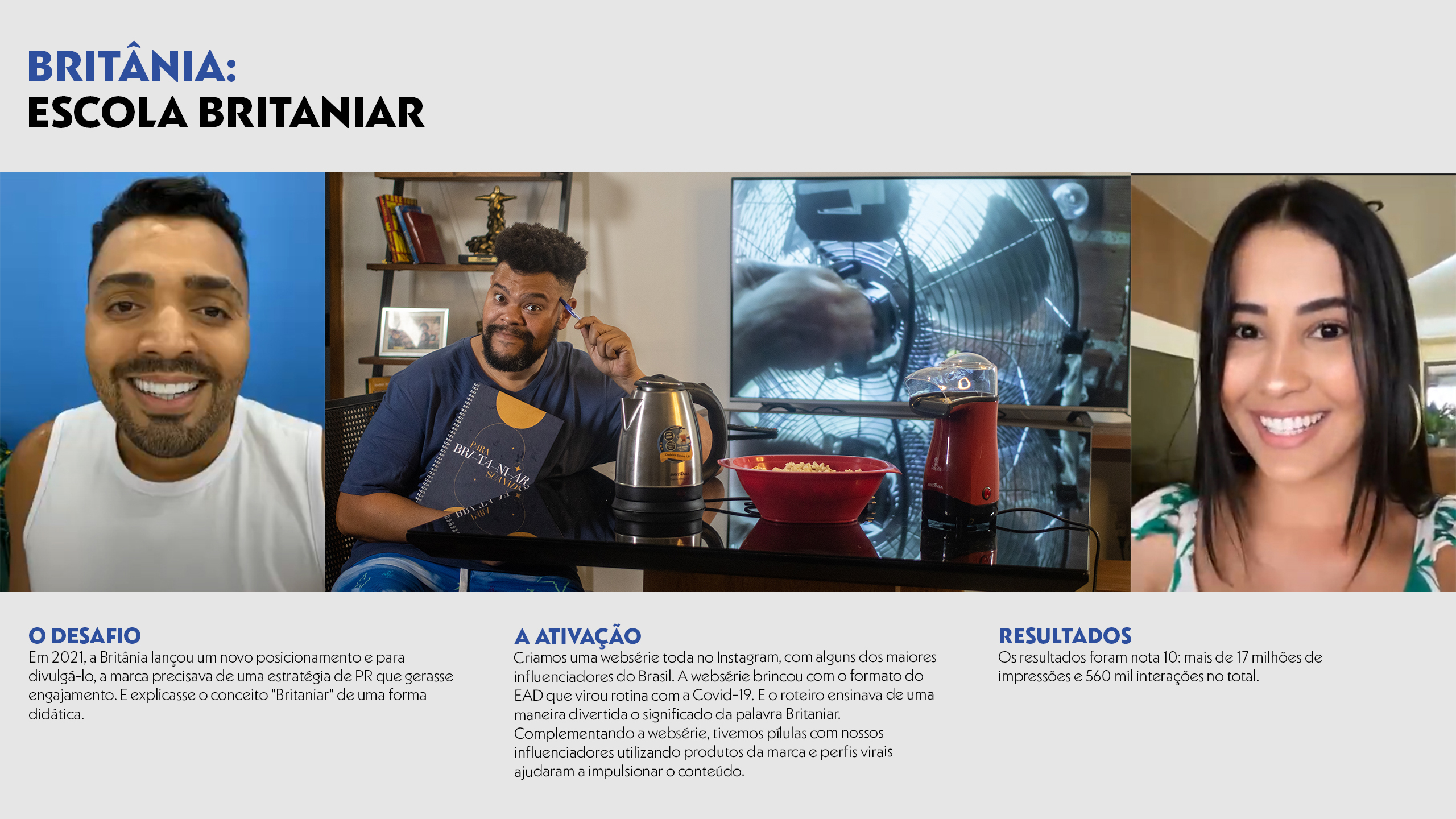 Em 2021, a Britânia lançou um novo posicionamento e para divulgá-lo, a marca precisava de uma estratégia de PR que gerasse engajamento. E explicasse o conceito de "Britaniar" de uma forma didática. Criamos uma websérie no Instagram com alguns dos maiores influenciadores do Brasil. A websérie brincou com o formato EAD que virou rotina com a Covid-19. E o roteiro ensinava de uma maneira divertida o significado da Palavra "Britaniar". Complementando a websérie, tivemos píllulas de conteúdo com nossos influenciadores utilizando produtos da marca e perfis virais ajudaram a impulsionar o conteúdo.